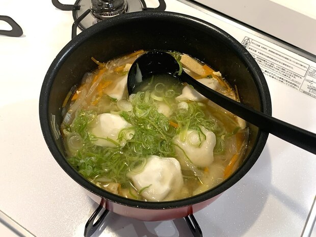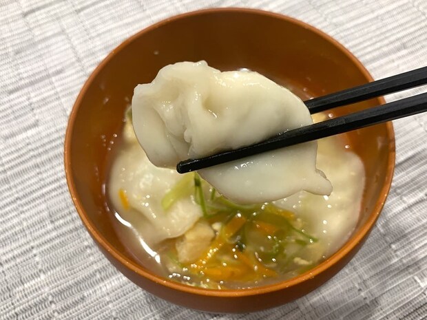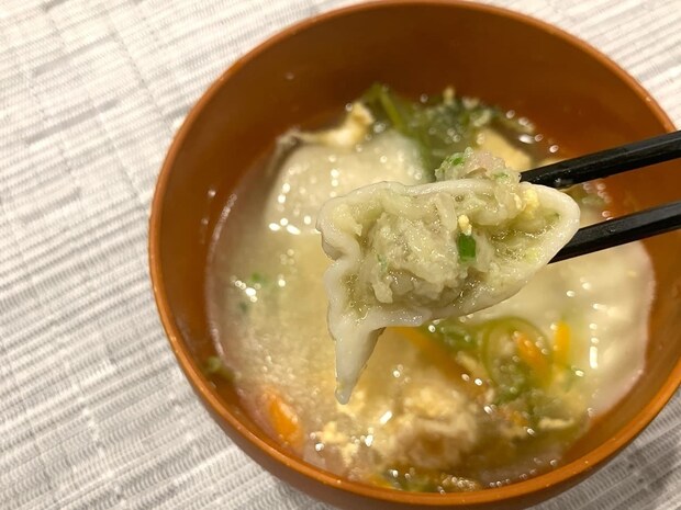 ねぎ、玉ねぎ、にんじん、油揚げなどと合わせて中華スープにすると、餃子のもちもちとした皮にスープがよく絡んで美味しくいただけます。
