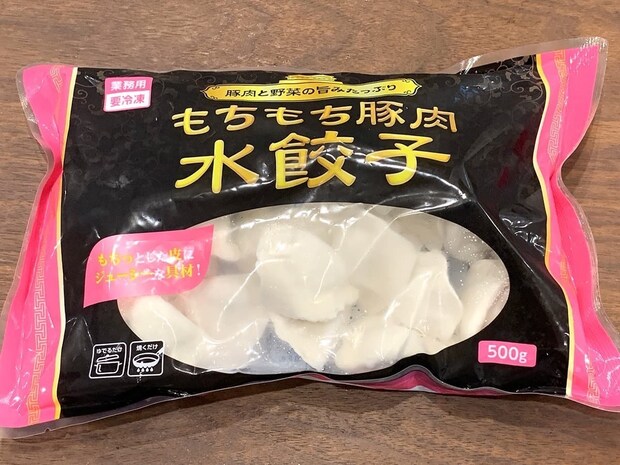 厚みのある皮のもちもちとした食感が特徴の「もちもち豚肉水餃子」です。豚肉をはじめ、キャベツ、ニラ、ねぎ、しょうがを使用したシンプルな冷凍水餃子で、内容量は500g(25個入り)となっています。