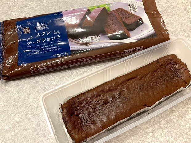 業務スーパーの定番人気「スフレチーズケーキ」の姉妹品である「スフレチーズショコラ」です。チーズ生地にチョコレートを練り込んだ冷凍スイーツで、測ってみたところ長さ約23cm、重さ約306gと非常にボリュームがあります。