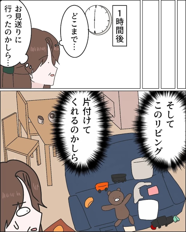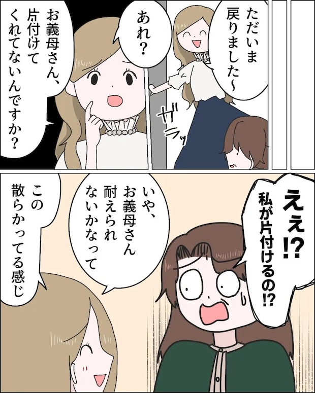 友達とお茶をしに出かけていたヨシコさんが家に戻ると、アミさんが友達親子を招いていました。何も聞かされていなかったヨシコさんは驚きつつも笑顔で挨拶。お友達親子はヨシコさんの帰宅後すぐに帰りましたが、見送りに行くと言って外に出たアミさんがなかなか戻ってきません。リビングは子どもたちが遊んだおもちゃが散らかったままで、アミさんが帰ってきたら注意すべきなのか、自分が気を遣って片付けるべきなのか悩むヨシコさん。1時間後に帰ってきたアミさんが散らかったままのリビングを見て「お義母さん、片付けてくれてないんですか?」とヨシコさんが片付けてくれることを期待していたようなセリフを口にしたのでヨシコさんはビックリ。思わず「え?私が片付けるの?」と言うと、アミさんは悪びれもせず「いや、お義母さんこの散らかってる感じ耐えられないかなって」と笑って言いました。