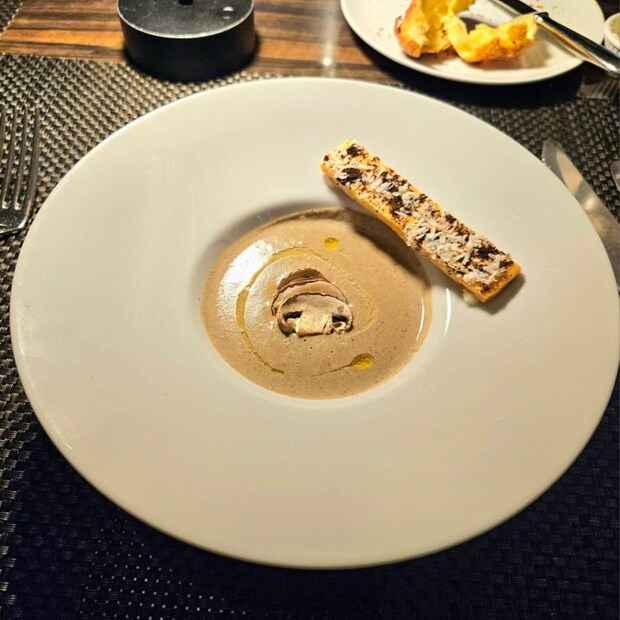 この日のスープはポルチーニのヴルーテスープ 焦がしマッシュルームのバトン添えでした。コースによってスープの種類はさまざまです。クリーミーで美味しい!