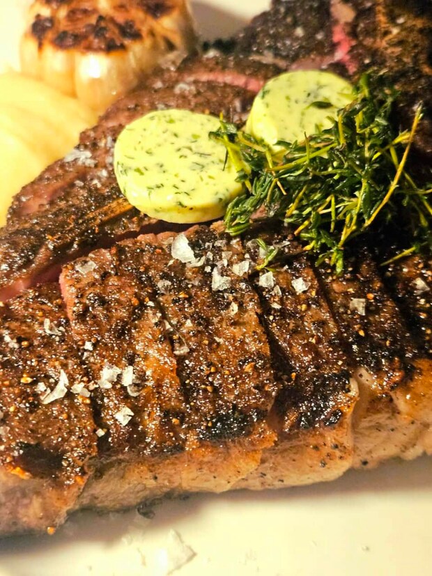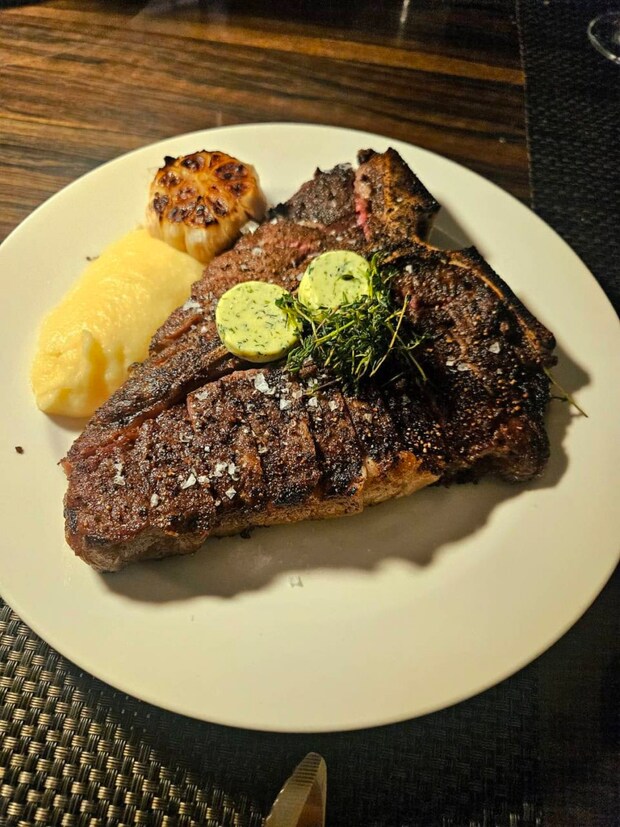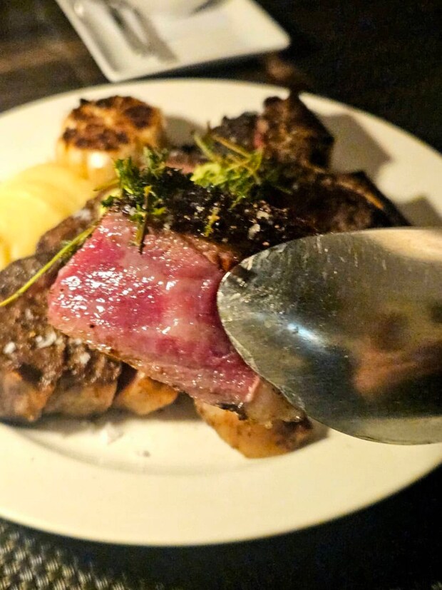 さあ、本題です。私たちはお肉を食べにきたのです。いただきましょう、本日の目的、Tボーンステーキ!あ、いまさらですがTボーンステーキとは、骨をT字型にはさんでサーロインとヒレ肉の両方を味わえる骨付きの牛肉のステーキのこと。だって、ステーキの華であるサーロインも、柔らかいヒレ肉もどちらも食べたいじゃない!