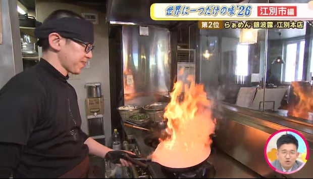 「スープに風味付けをするために炎のパフォーマンスを上げています。強い火力で一気にガッと出すのが大事」と専務が説明するように、すべてのラーメンの香ばしさの基礎となる重要な工程なのです。