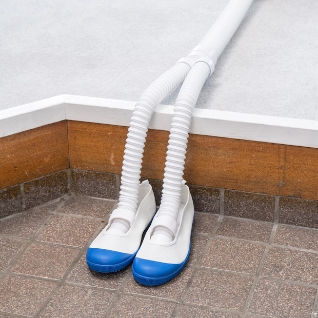 乾燥ホースは固めにつくられているので、靴の形状に合わせて固定することができます。高さのある靴やブーツでも乾燥中に倒れる心配がなく、玄関に置いたまま使用できます。
