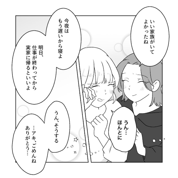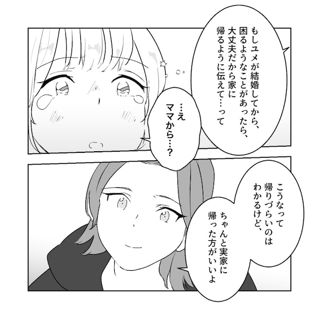 「もしユメが結婚してから、困るようなことがあったら、大丈夫だから家に帰るように伝えて・・って」と穏やかな声でアキが言いました。「・・え、ママから・・?」思ってもいなかった言葉に驚き、思わず涙が引っ込みました。そんな私に「こうなって帰りづらいのはわかるけど、ちゃんと実家に帰った方がいいよ」と背中を押してくれるアキ。