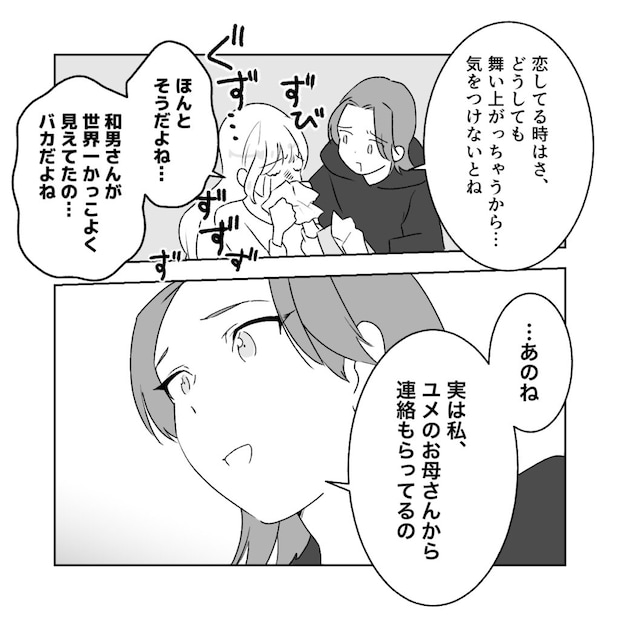 涙が止まらない私に「恋してる時はさ、どうしても舞い上がっちゃうから・・気をつけないとね」とアキが優しく言ってくれ、「ほんとそうだよね・・。和男さんが世界一かっこよく見えてたの・・バカだよね」とアキの優しさと自分の情けなさにますます涙がこみ上げる私。すると、「・・あのね。実は私、ユメのお母さんから連絡もらってるの」とアキが切り出しました。