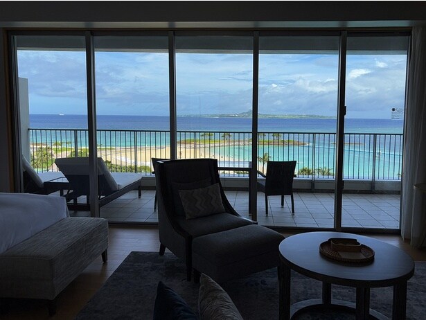 「クラブウイング」の客室は3タイプで、すべてがスイート仕様。どの部屋からもエメラルドグリーンの海と伊江島が溶け合った眺望を望むことができる。木の温もりを感じられる落ち着いた内装に、広々としたリビングスペース、バルコニーから夕日を眺める時間は、まさに圧巻の一言。空と海がオレンジ色に染まる壮大なサンセットを独り占めできる。誰にも邪魔されないプライベートな空間で、心ゆくまでくつろごう。
