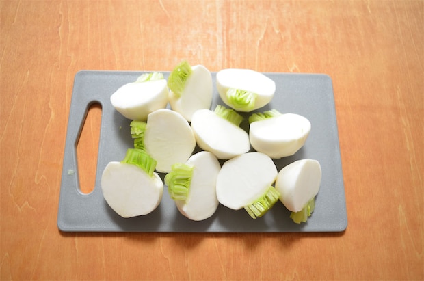 1. かぶの葉を切り落とし、ピーラーで皮を剥く。