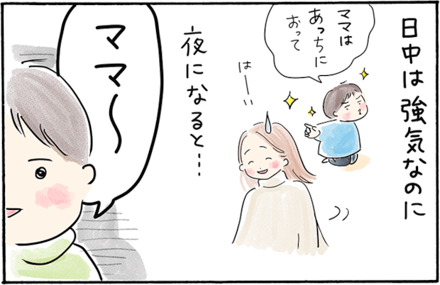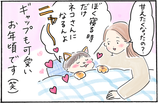 保育園の年少クラスに通い始めた3歳の男の子。日中は「なんでも自分でする!」と強気な態度を見せながらも、夜になると「ネコさんだから一緒に寝ましょ♪」とママに甘える姿にほっこりしますね。自立心と甘えたい気持ちが入り混じる3歳児の成長に、共感できる体験談です。