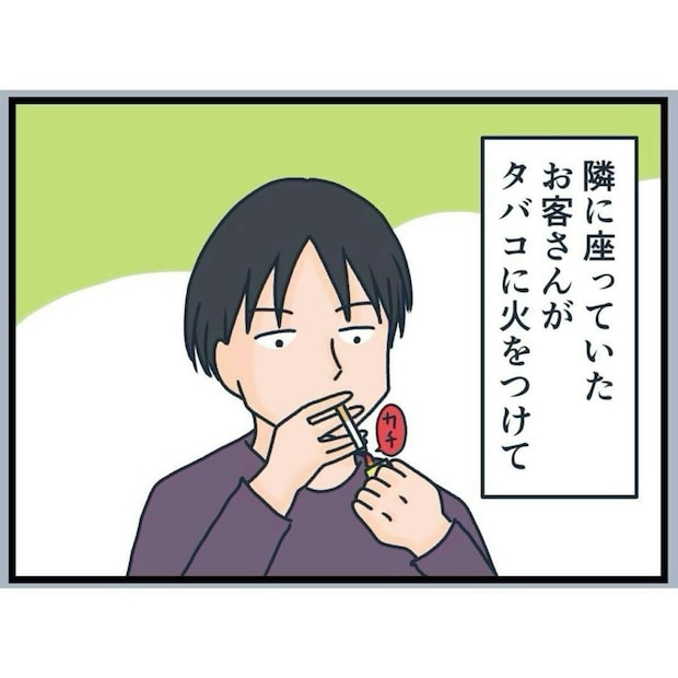 喫煙席でタバコを吸っている人に対し、せき払いやケムリを払う仕草をする、問句さん。マナーとしては、問句さんの方が禁煙席に移動するのが、常識的な行動ですよね。
