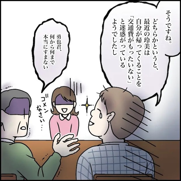 「そうですね、どちらかというと最近の玲美は自分が帰ってくることを『交通費がもったいない』と迷惑がっているようでしたし」目に涙を浮かべ、どこか遠くを見るようにしてそう話す勇也さん。すると義父が、震える声で頭を下げ、「勇也くん、何から何まで本当にすまない」と謝罪します。