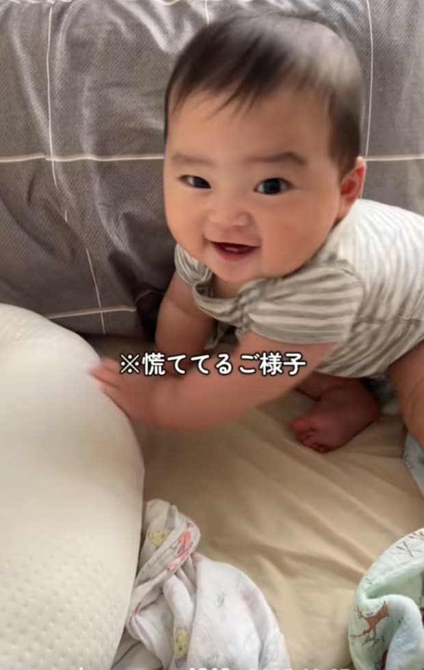 ママさんが見ていないうちに何やらイタズラしている赤ちゃん。ママさんが声をかけると、ビクッと驚く赤ちゃんが可愛すぎました♡