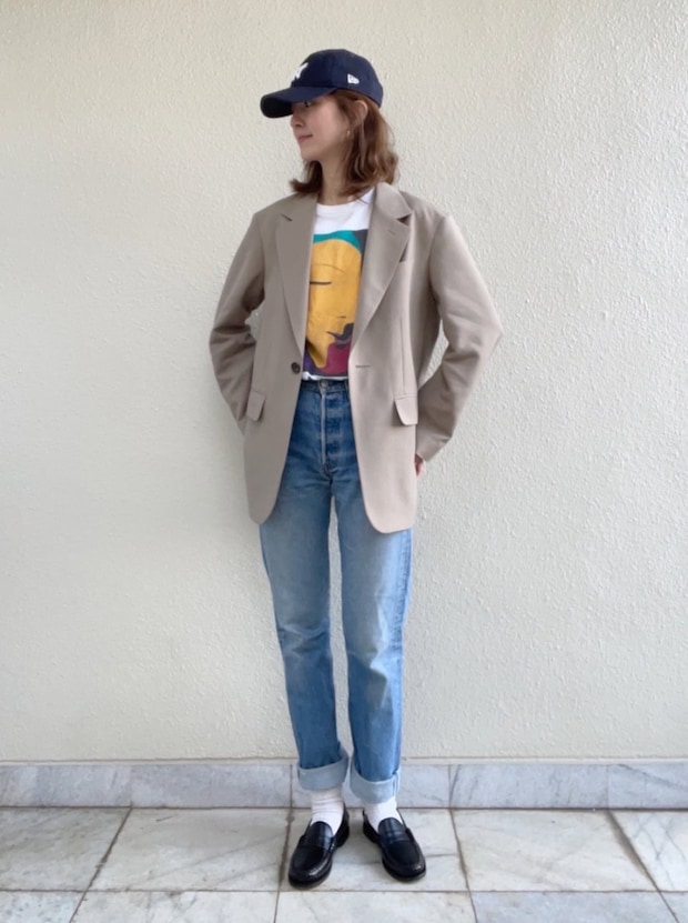 「大人っぽい印象のベージュのジャケットをメインに。大柄な古着Tを合わせ、キレイめに寄り過ぎないバランスを意識してスタイリングしました。キャップとデニムでベースはカジュアルにまとめつつ、足元をローファーにすることで大人っぽさをキープしています」