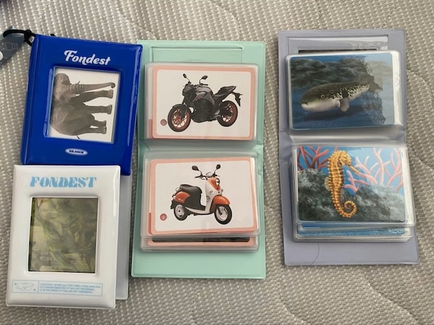 ダイソーの「PVCカードケース」と「ものしりカード」を使ったミニ図鑑。ものしりカードは、いくつか種類があるそう。動物や乗り物など、子どもの興味に合わせて選べる点がうれしいですね。カードを差し入れるだけなので簡単です。