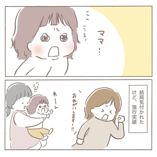 そっと抜け出す作戦で行こうとしていたcoromoさん。しかし、さすがは娘さん。ママの気配が消えたことにすぐ気づき、泣き出してしまいました。それでも病院には向かわなければならず、coromoさんは後ろ髪を引かれつつも強行突破することに。