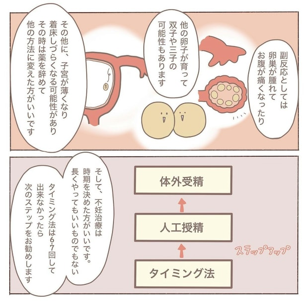 排卵が起きていない可能性があるため、卵を刺激して育てる薬を処方することになりました。また、不妊治療は取り組む時期を決めて進めた方が良いとアドバイスも受けました。