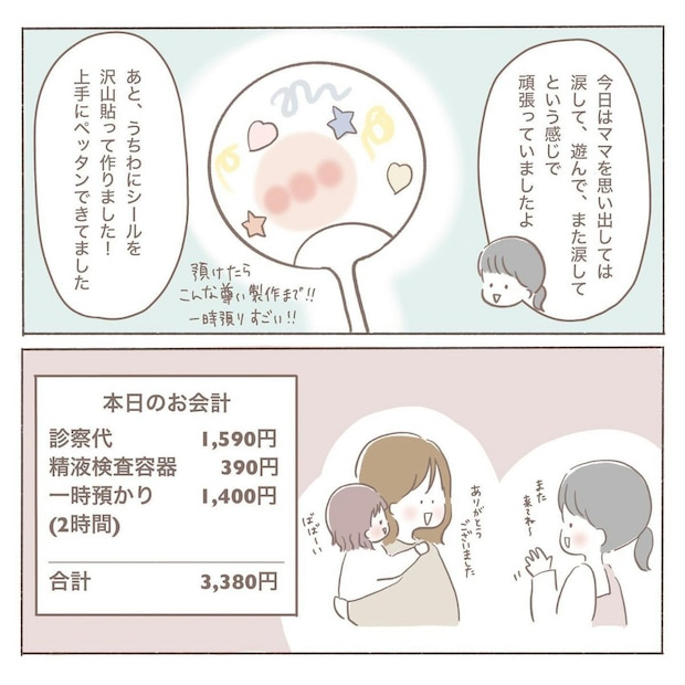 2度目の一時預かりを利用して病院へ向かったcoromoさん。診察では排卵していないと言われ、原因も特定できないとのことでした。お迎えに行くと、娘さんは涙を浮かべていたものの、先生と一緒にかわいい作品を作っていたようで、また一歩成長した姿を見ることができました。