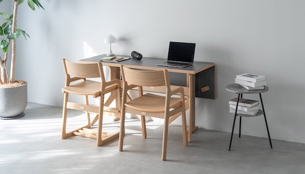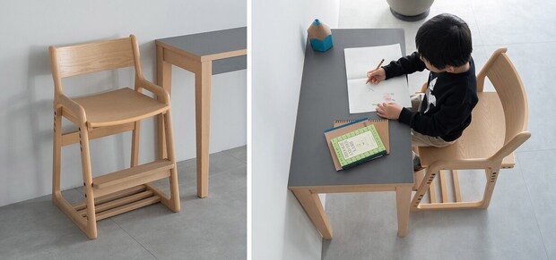 キッズチェアは座面・足置きの高さを細かく調節でき、成長に合わせて無理なくフィット。足置きは取り外しできるので、子どもから大人まで長く使用できます。
