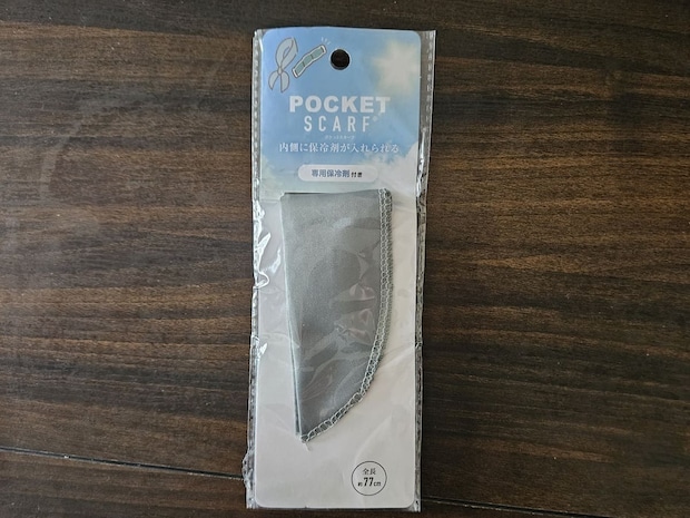 スカーフとスカーフのポケットに入る専用の保冷剤のセットで、長さは77cm、幅は5cmです。