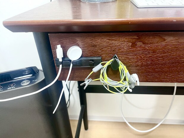 耐荷重100gの「車用マルチホルダー 3P」は、充電ケーブルをかけるのに十分です。床に垂れてしまうケーブルを掛けておけば、デスク周りがスッキリ!