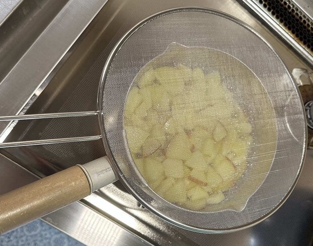 ミニゆでザルの持ち手にはくぼみがついているので、茹でたい食材を入れてお鍋のふちに引っ掛ければOKです。