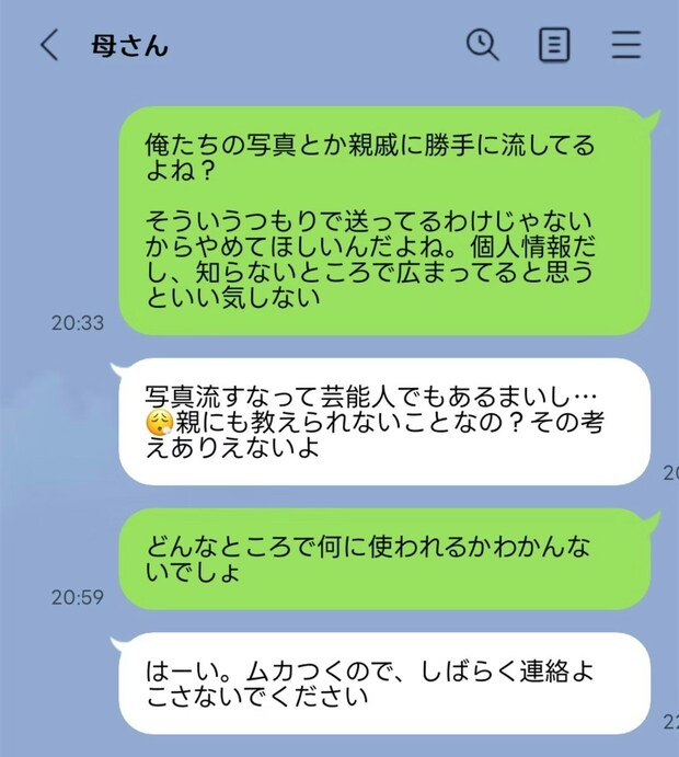 知り得た情報、写真をすぐにあちこちに漏洩するため、嫌な旨を旦那から話すと「(うちの子が)芸能人でもあるまいし、親にも教えられないことなのか!」と激怒、旦那としばらく連絡をとらないなどストライキする。