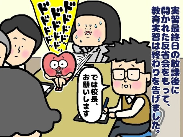 教育実習の反省会で、校長先生がゆっくりと口を開きました。主人公の心臓は、今にも飛び出しそうなほど緊張で高鳴っていました。
