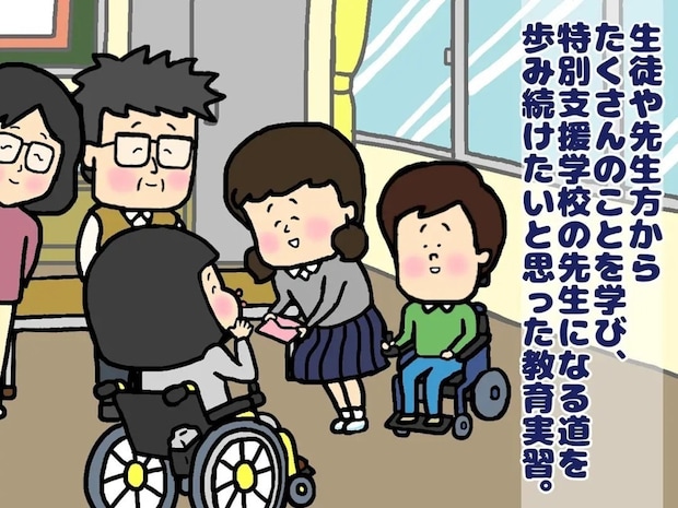 家族や先生方に支えられながら、教育実習をやり遂げた主人公。多くの学びと出会いを通して、特別支援学校の先生になりたいという思いはいっそう強くなりました。