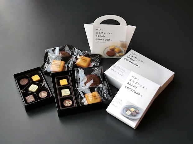 「パンとエスプレッソと」のロゴ入りのコーヒーガナッシュチョコレートをはじめとした、くちどけの良いショコラの詰め合わせです。