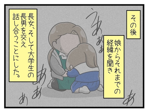めいさんの様子がおかしいと聞いて、母親は慌てて帰宅。すると、めいさんが泣きながらこれまでの状況を話してくれました。ここからめいさんのピンチを救うため、母親、長男、姉が反撃を開始します。