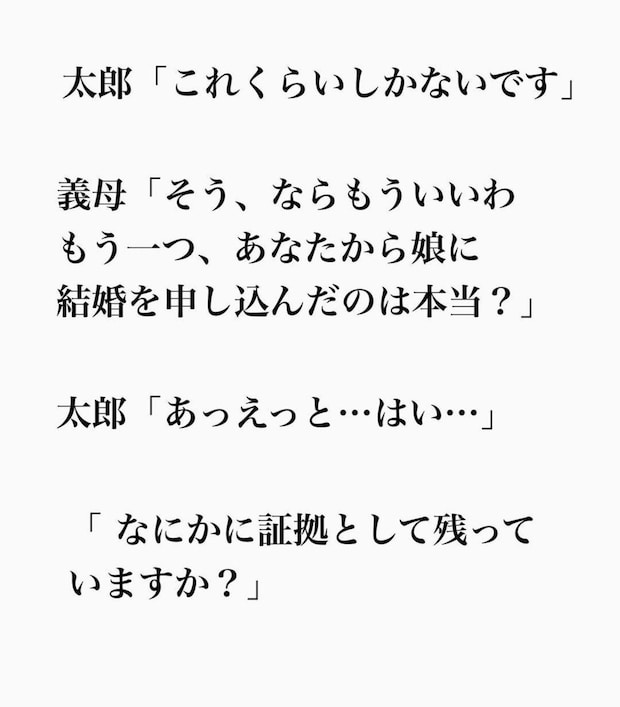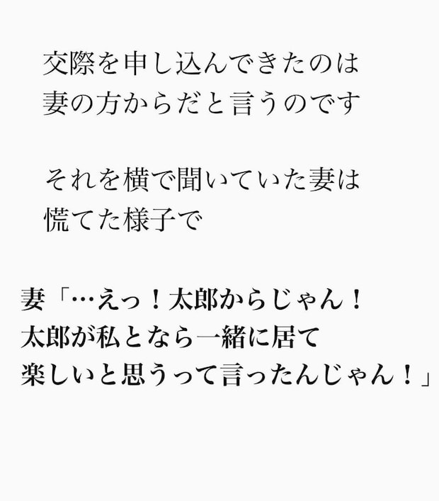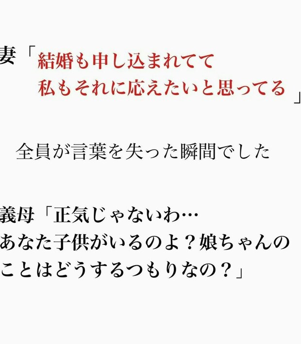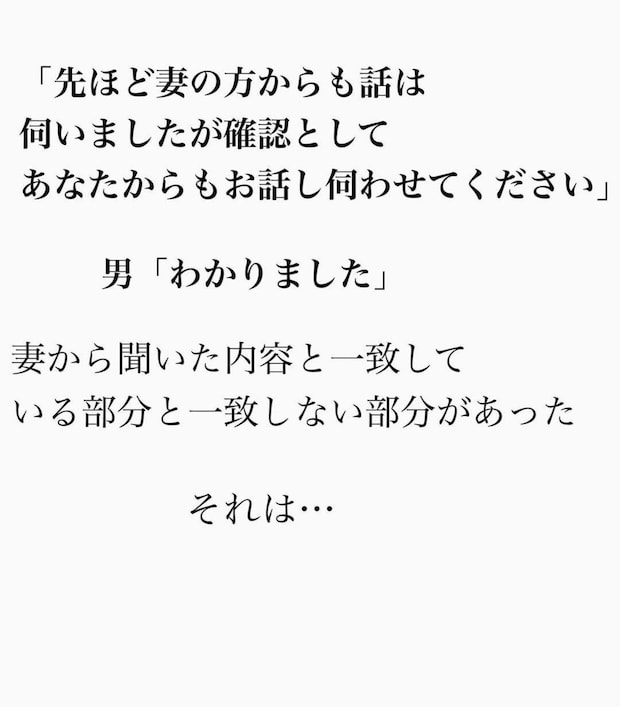 不倫したことを悪びれる様子もなく、堂々と「再婚」を宣言した妻。夫・太一さんだけではなく、その場にいた妻の母や夫の母も凍りつきます。