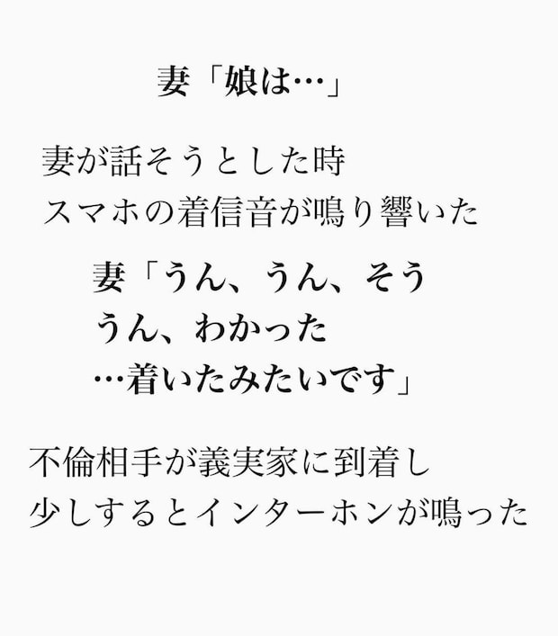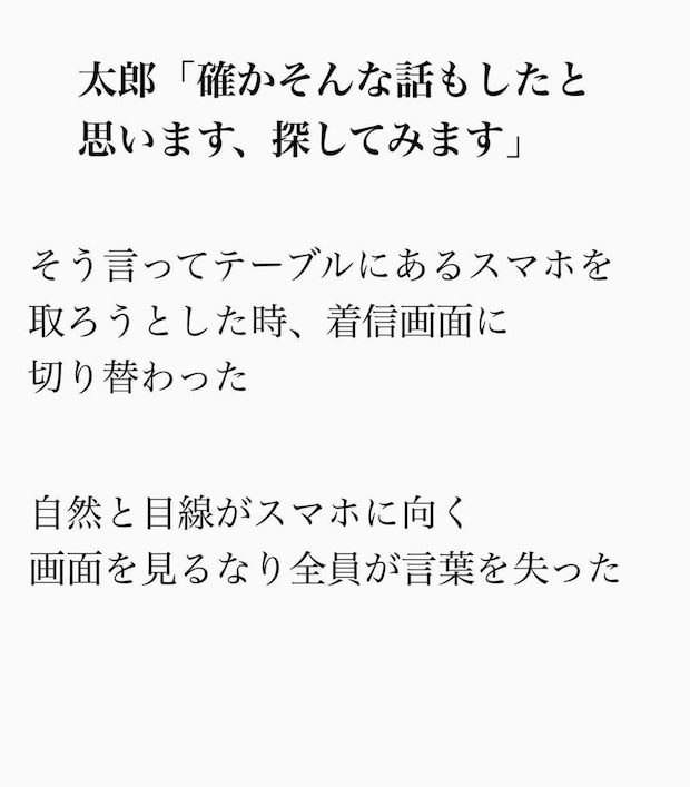 ところが、太郎のスマホには「妻」からの着信を知らせる画面が…。W不倫が発覚した瞬間でした。