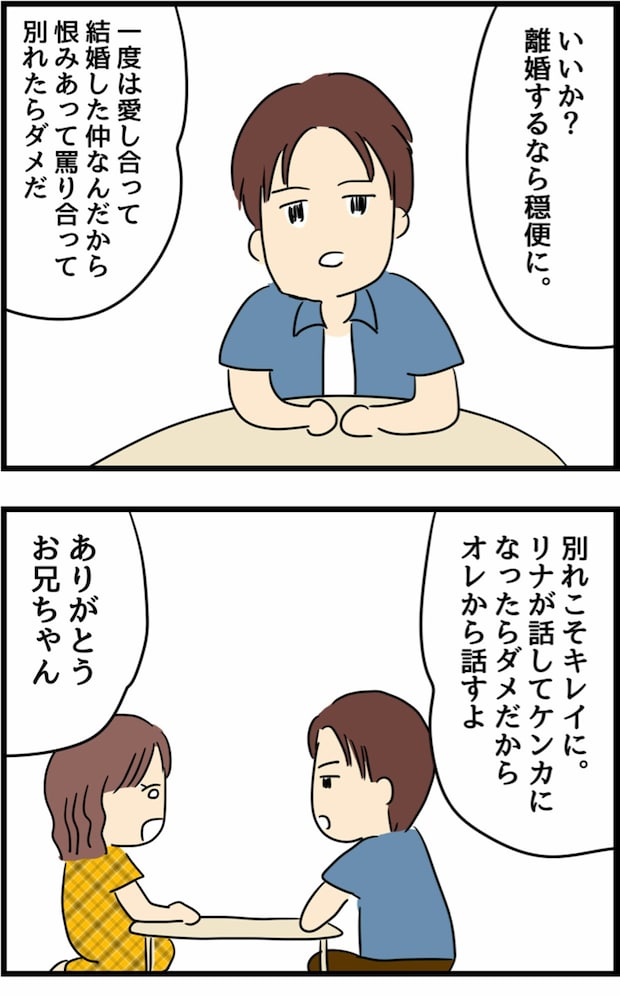 主人公・リナさんと夫・わたるくんは結婚4年目。ある日、夫の不倫が発覚します。友人や弁護士に相談し、慰謝料を請求して離婚することを決めました。不倫の証拠がそろったため、兄にも協力してもらい、いよいよ夫へ離婚を切り出すことに…。