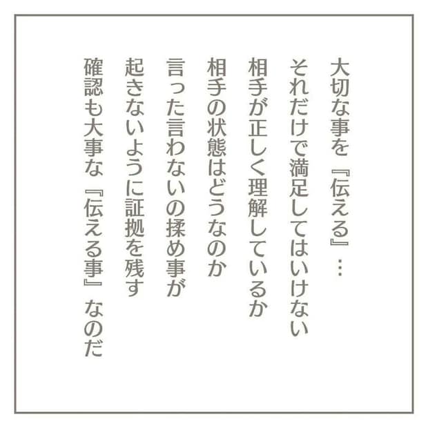 よく、「言った、言わない」で問題になることがあります。大事なことは、相手が理解するまで伝えること。そして伝えた証拠を残すとさらによいのかもしれません。