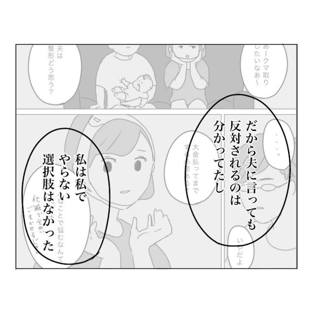 無事手術を終え、家族にバレずに帰宅することができました。しかし翌日の朝、息子のひょんなイタズラで、夫に美容整形の同意書が見つかってしまいます。夫に説明を求められ、焦りますが、整形に後悔のないもいもいさんは自分の思いを伝えることにします。