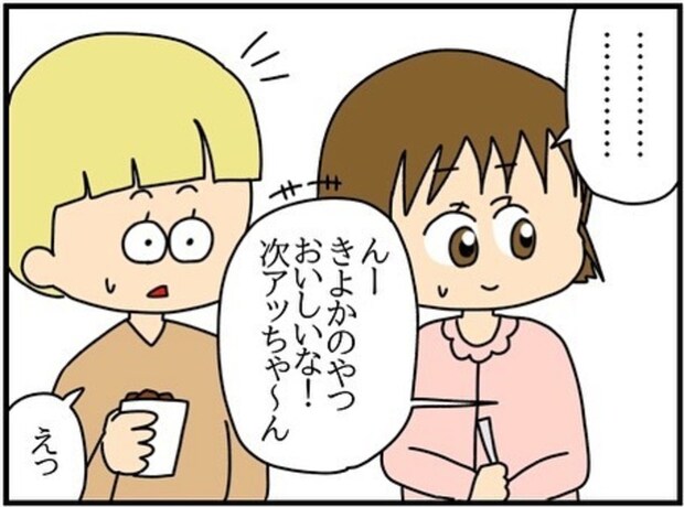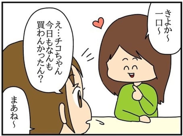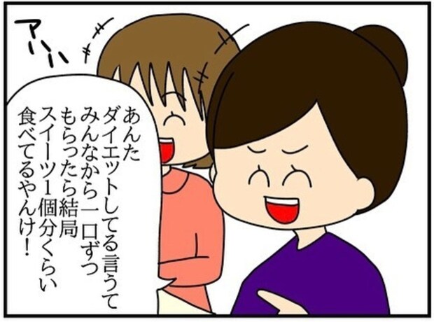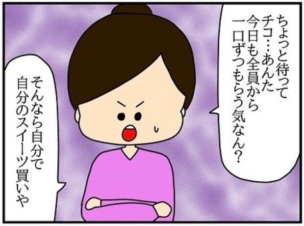 ダイエット中のため、自分だけスイーツを買わなかったチコちゃん。見ていたら我慢ができなくなり、同期のみんなから一口ずつもらいます。