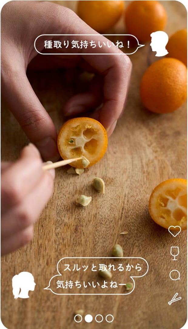 金柑は半分に切ってから種を取るのがポイント。そうすることで、薄く切ったときに細かい種が残らず、えぐみが出にくくなり、口当たりよく仕上がる。