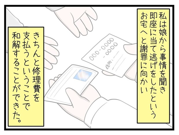 めいさんと母親は、「当て逃げ」だと脅されていた件を、車の持ち主への謝罪と修理代を払うことで解決させました。母親はめいさんに「わざとではなくても逃げてはダメ」と諭します。中学校にも事情を伝え、相手が脅す理由をなくしていきました。