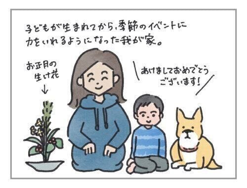 子供が産まれてから季節のイベントを楽しむようになった我が家(ハハのさけび#42参照)では、年末にお正月らしい花を買ってきて飾りました。家の中にお花があると、おめでたさも増す気分!お花って長くても2週間くらいの命なので、贅沢品なのですが。