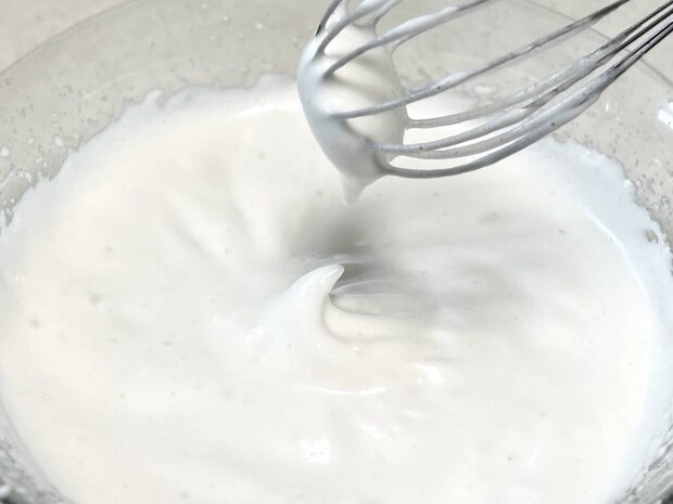 ハンドミキサーの高速モードで、軽くツノが立つまで泡立てます。