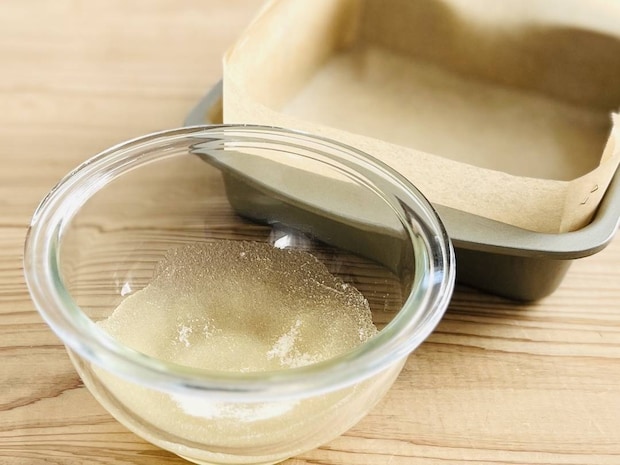 粉ゼラチンをふやかし、型にクッキングシートを敷く