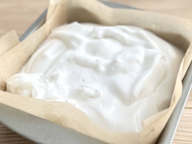 クッキングシートを敷いた型に流し入れ、ラップをかけて、冷蔵庫で1時間ほど冷やし固めます。