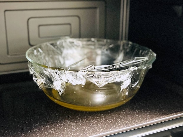 大きめの耐熱容器にはちみつと残りの水(50cc)を入れ、はちみつが溶けるまでよくかき混ぜます。ふんわりとラップをかけて、電子レンジ600Wで1分加熱します。