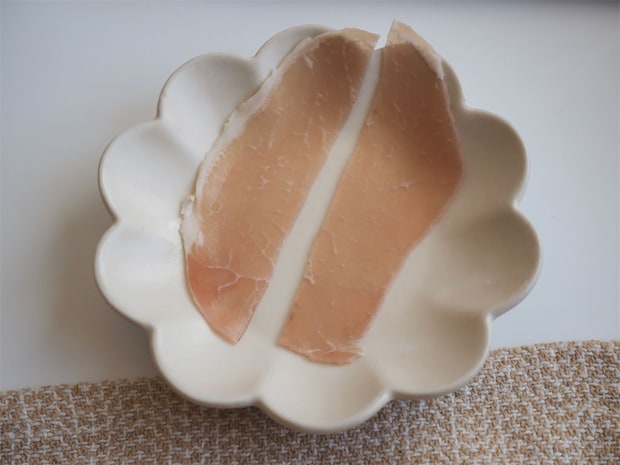 3. 生ハムを半分に切る。
