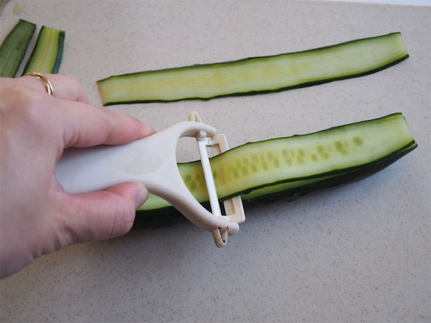 2. きゅうりをピーラーで縦にスライスする。