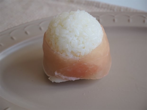 1. ご飯を80gずつに分けて卵型に握る。塩をつけてラップで包み、立てた状態で置いておく。