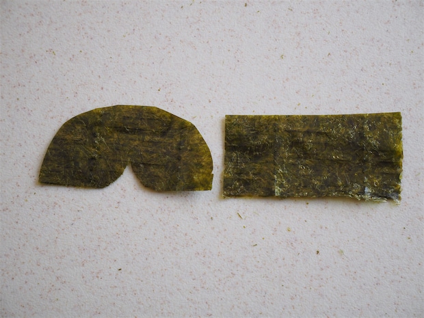 6. 焼きのりを2つの形に切って、4と5のてっぺんに貼りつける。