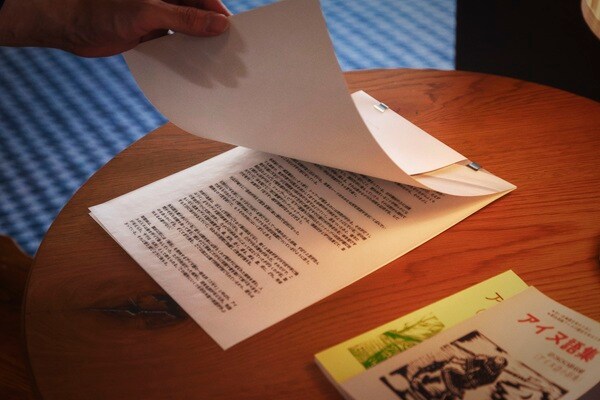 今宿氏は作品について、「層雲峡で書いた散文詩を、薄いアイヌ語集で逐語置換し、訳せない語を空白として残したZINE。空白は失われた言語層を可視化し、薄紙の日本語が下層の断片を覆いながら透かす。覆う/残す矛盾を造本で固定する」と語っている。