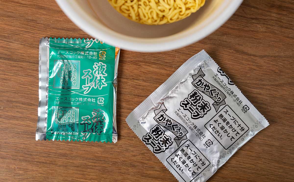 カップの中には、麺と一緒に「かやく入り粉末スープ」と「液体スープ」の袋が入っています。