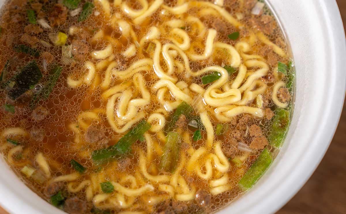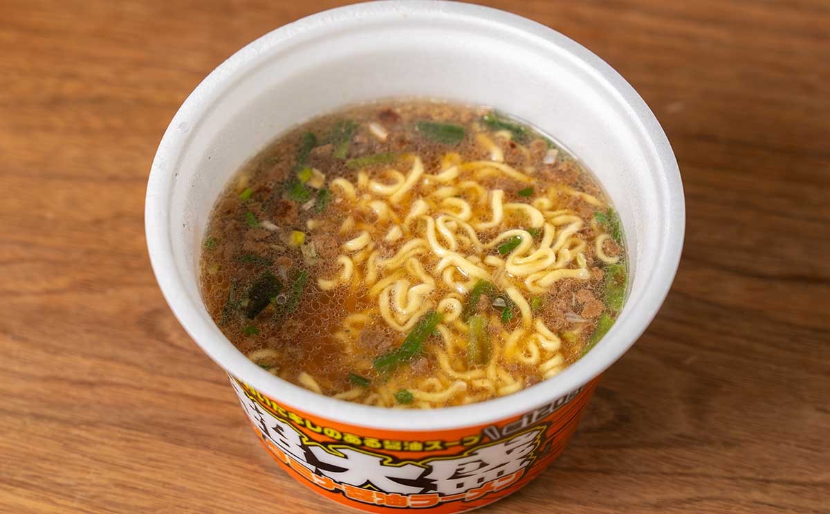 フタに“にんにくの利いたキレのある醤油スープ”と書かれているとおり、スープはしっかりとしたにんにくの風味を感じます。ポークとオニオンのうまみがきいたスープは、濃厚でコク深い味わいに。やや太めでほどよい弾力のある麺との相性が抜群にいいですね。かやくの肉そぼろも味は濃いめで、ニラの存在感もばっちり。